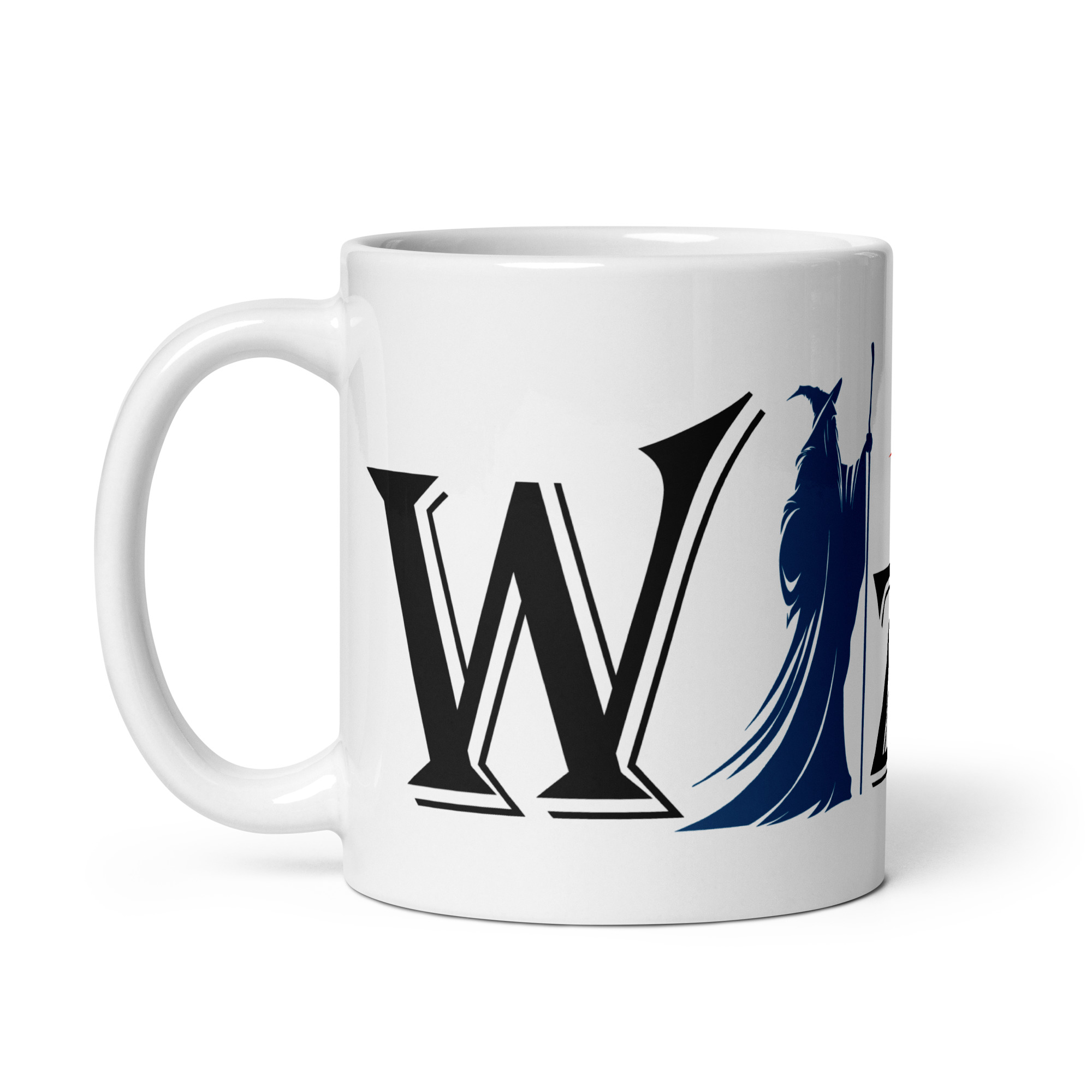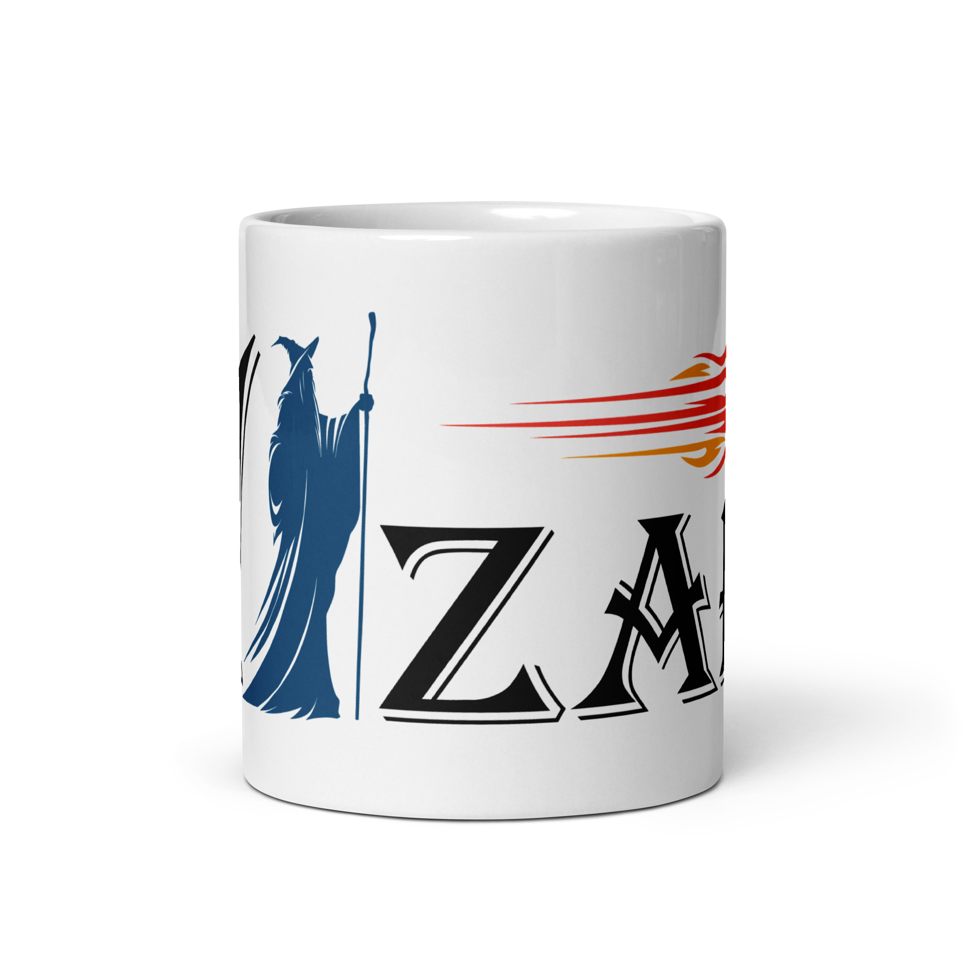This mug bears the mark of decisive arcana: the word Wizard, with a lone robed silhouette standing in for the i, arm raised and fireball already in flight. No hesitation. No follow-up questions. Just a clear statement of magical philosophy.